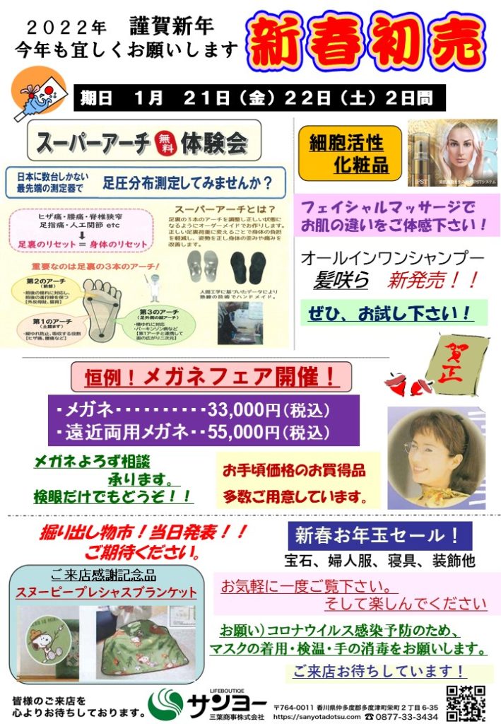 2022年1月1日 / 最終更新日 : 2021年12月15日 kamioka お知らせ 新春初売展のご案内 2022年 今年もよろしくお願いします。 1月21日(金)22日(土)初売展示会を開催します。是非ともご来店下さい。 お待ちしております。