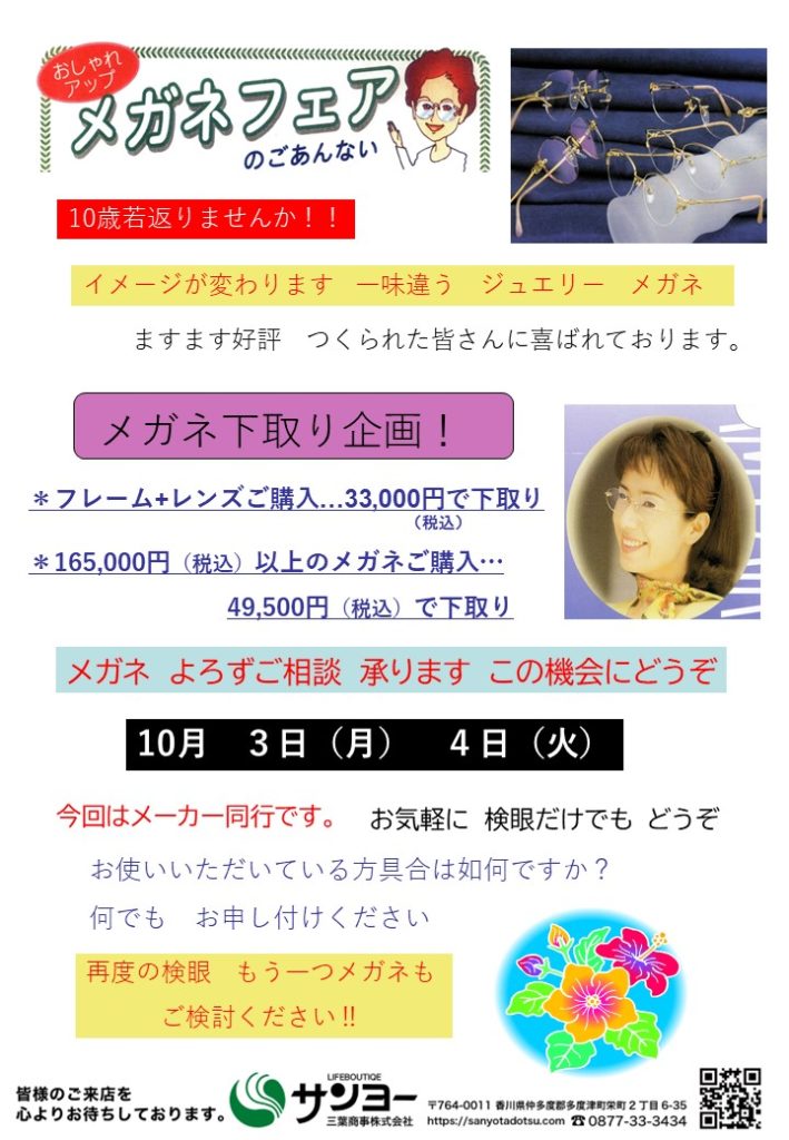 2022年9月17日 / 最終更新日 : 2022年9月14日 kamioka お知らせ メガネ同行企画のお知らせ いつもお世話になっております。 10月3日(月)・4日(火)メガネの先生とお宅にお伺いします。 視力検査やメガネの調整など、お気軽にお申し付けください。