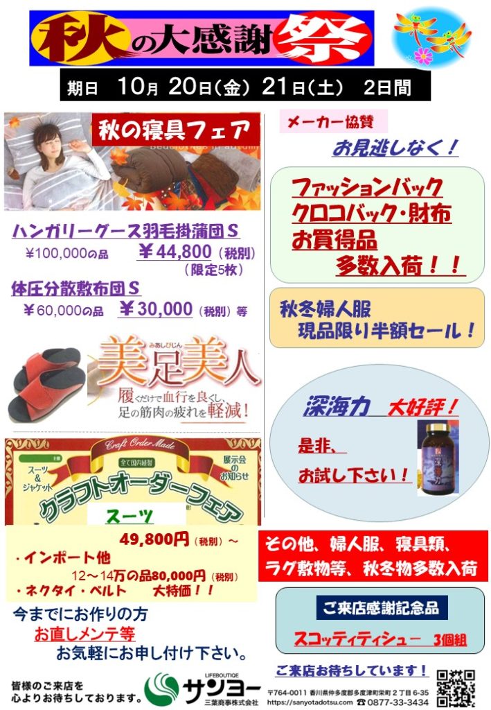 2023年10月1日 / 最終更新日 : 2023年9月13日 kamioka お知らせ 10月秋の大感謝祭のお知らせ いつもお世話になり、ありがとうございます。10月20日(金)・21日(土)展示会を開催します。 皆様、ぜひご来店下さい。お待ちしております。