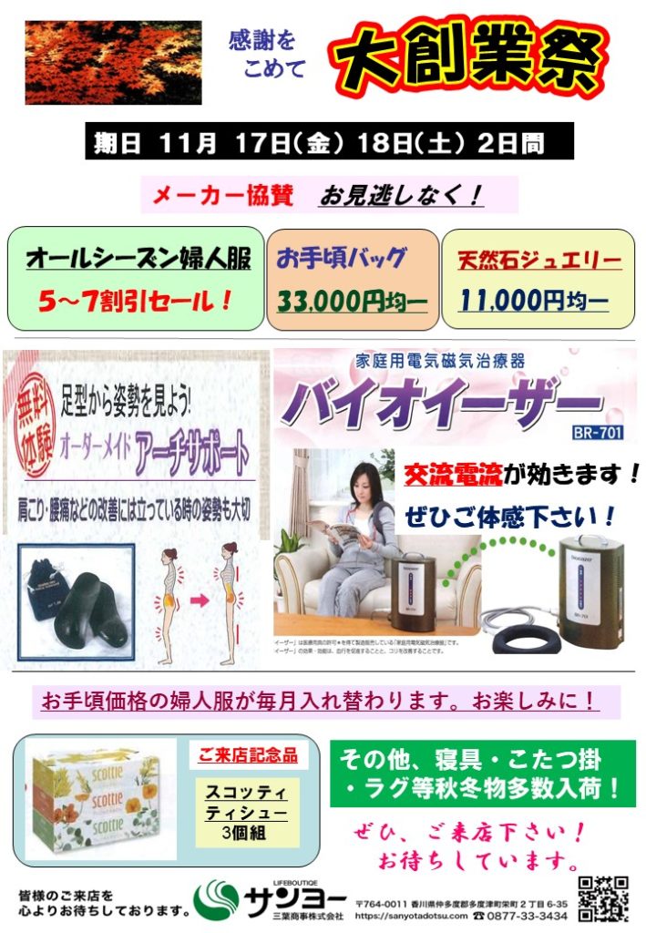 2023年10月22日 / 最終更新日 : 2023年10月18日 kamioka お知らせ 11月大創業祭のお知らせ いつもお世話になり、ありがとうございます。11月17日(金)・18日(土)大創業祭展を開催します。 皆様、ぜひご来店下さい。お待ちしております。