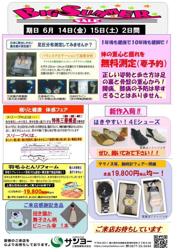 2024年5月22日 / 最終更新日 : 2024年5月22日 kamioka お知らせ 6月ビッグサマーセール展のお知らせ いつもお世話になっております。6月14日(金)・15日(土)展示会を開催します。 ぜひご来店下さい。お待ちしております。