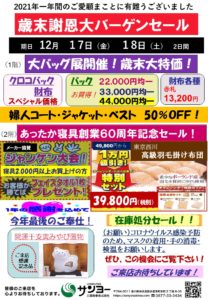 12月17日(金)・18日(土) 2021年一年間の感謝を込めて、今年最後のバーゲン展を開催します。 お買得品を多数ご用意してお待ちしております。是非ともご来店下さい。