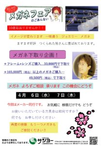 いつもお世話になっております。4月6日(水)7日(木)メガネ同行します。 お家までお伺いします。視力検査、調整もしますので、お気軽にお問い合わせください。
