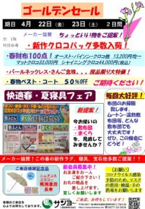 4月22日(金)23日(土)ゴールデンセール展を開催します。 ご来店お待ちしております!