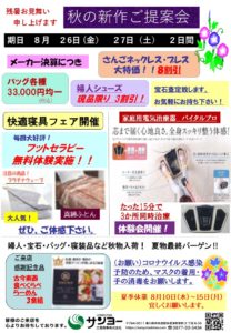 8月26日(金)・27日(土)秋の新作ご提案会を開催します。 夏物最終バーゲンもありますので、是非ともご来店下さい。