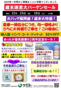 12月15日(金)・16日(土)歳末謝恩大バーゲンセールを開催します。 お買得品多数ご用意してお待ちしております。ぜひご来店下さい。