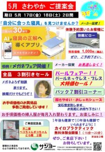 いつもお世話になっております。5月17日(金)・(土)展示会を開催します。 4月に引き続き、カイロプラクティック無料体験もできますので、 ぜひご来店下さい。お待ちしております。